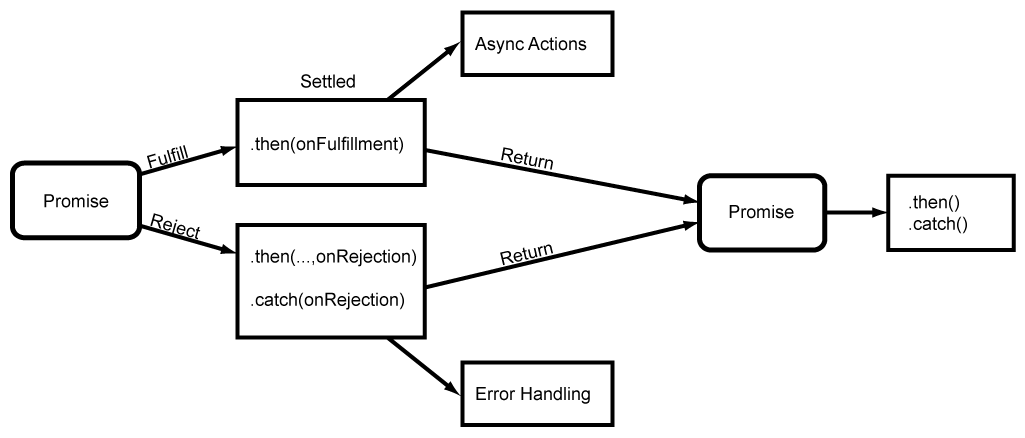 The eventual state of a pending promise can either be fulfilled with a value or rejected with a reason (error). When either of these options occur, the associated handlers queued up by a promise's then method are called. If the promise has already been fulfilled or rejected when a corresponding handler is attached, the handler will be called, so there is no race condition between an asynchronous operation completing and its handlers being attached.